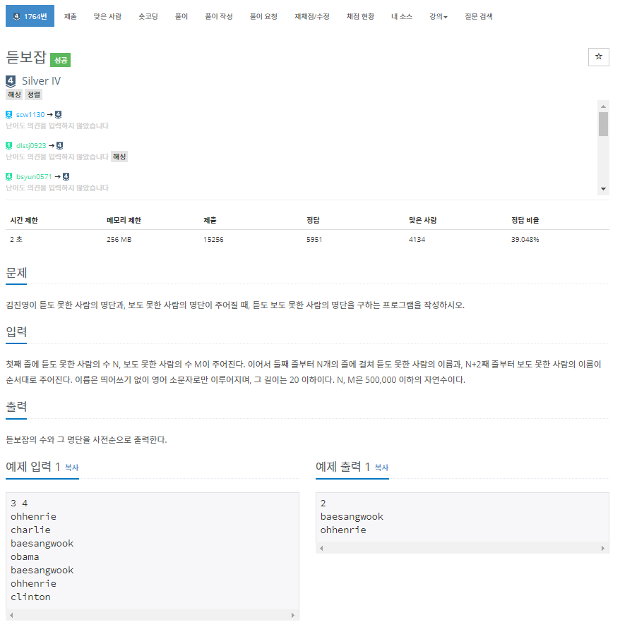 ์ฒซ์งธ ์ค์ ๋ฃ๋ ๋ชปํ ์ฌ๋์ ์ N, ๋ณด๋ ๋ชปํ ์ฌ๋์ ์ M์ด ์ฃผ์ด์ง๋ค. ์ด์ด์ ๋์งธ ์ค๋ถํฐ N๊ฐ์ ์ค์ ๊ฑธ์ณ ๋ฃ๋ ๋ชปํ ์ฌ๋์ ์ด๋ฆ๊ณผ, N+2์งธ ์ค๋ถํฐ ๋ณด๋ ๋ชปํ ์ฌ๋์ ์ด๋ฆ์ด ์์๋๋ก ์ฃผ์ด์ง๋ค. ์ด๋ฆ์ ๋์ด์ฐ๊ธฐ ์์ด ์์ด ์๋ฌธ์๋ก๋ง ์ด๋ฃจ์ด์ง๋ฉฐ, ๊ทธ ๊ธธ์ด๋ 20 ์ดํ์ด๋ค. N, M์ 500,000 ์ดํ์ ์์ฐ์์ด๋ค.