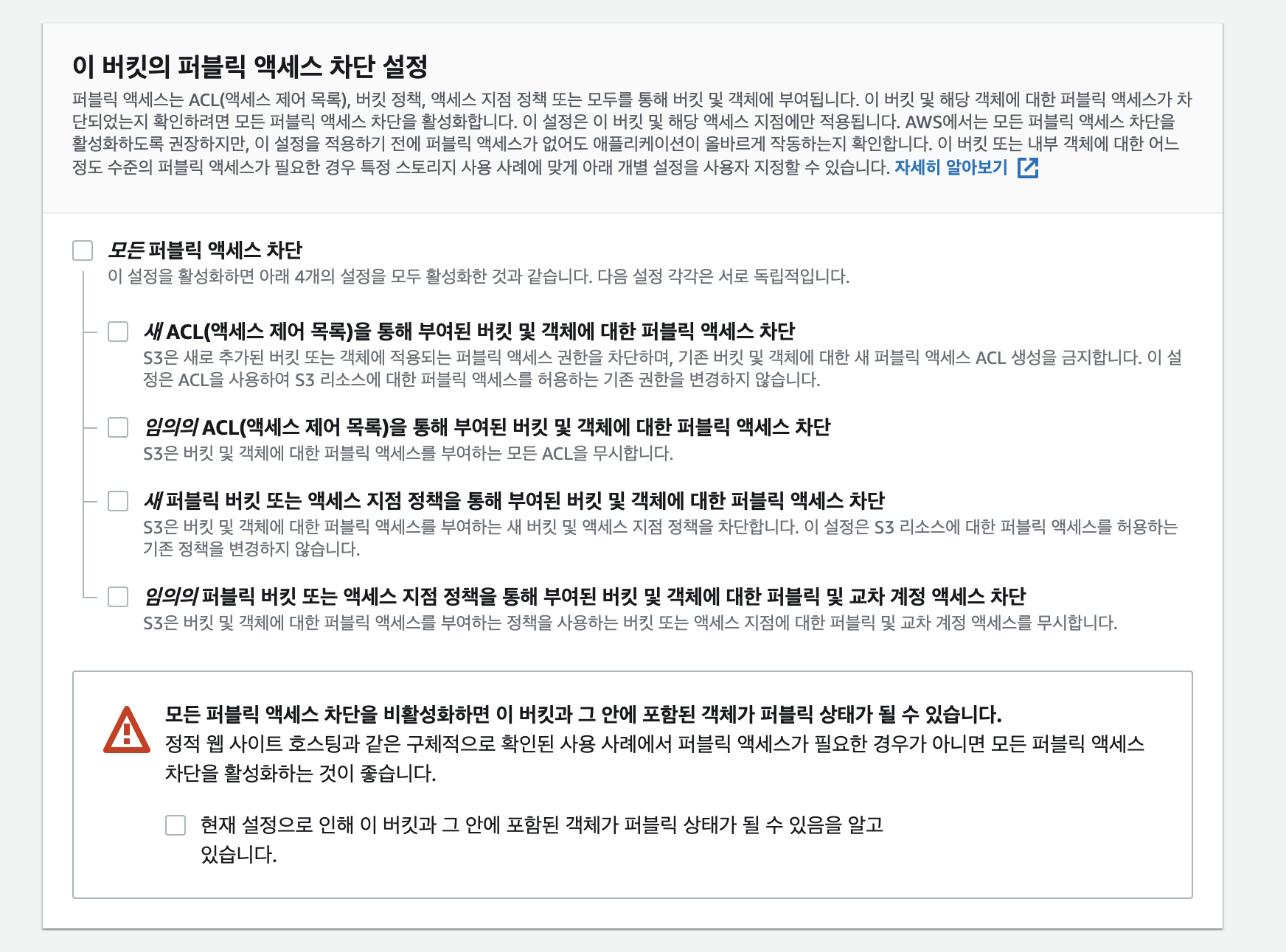 โป ์ธ๋ถ์ S3์ ๊ณต๊ฐํ ๊ฒฝ์ฐ ๋ชจ๋ ํผ๋ธ๋ฆญ ์ก์ธ์ค ์ฐจ๋จ์ ์ฒดํฌ ํด์ ํ๊ณ , ๊ณต๊ฐํ์ง ์๋๋ค๋ฉด ์ฒดํฌ๋ฅผ ํด์ฃผ์๋ฉด ๋ฉ๋๋ค.