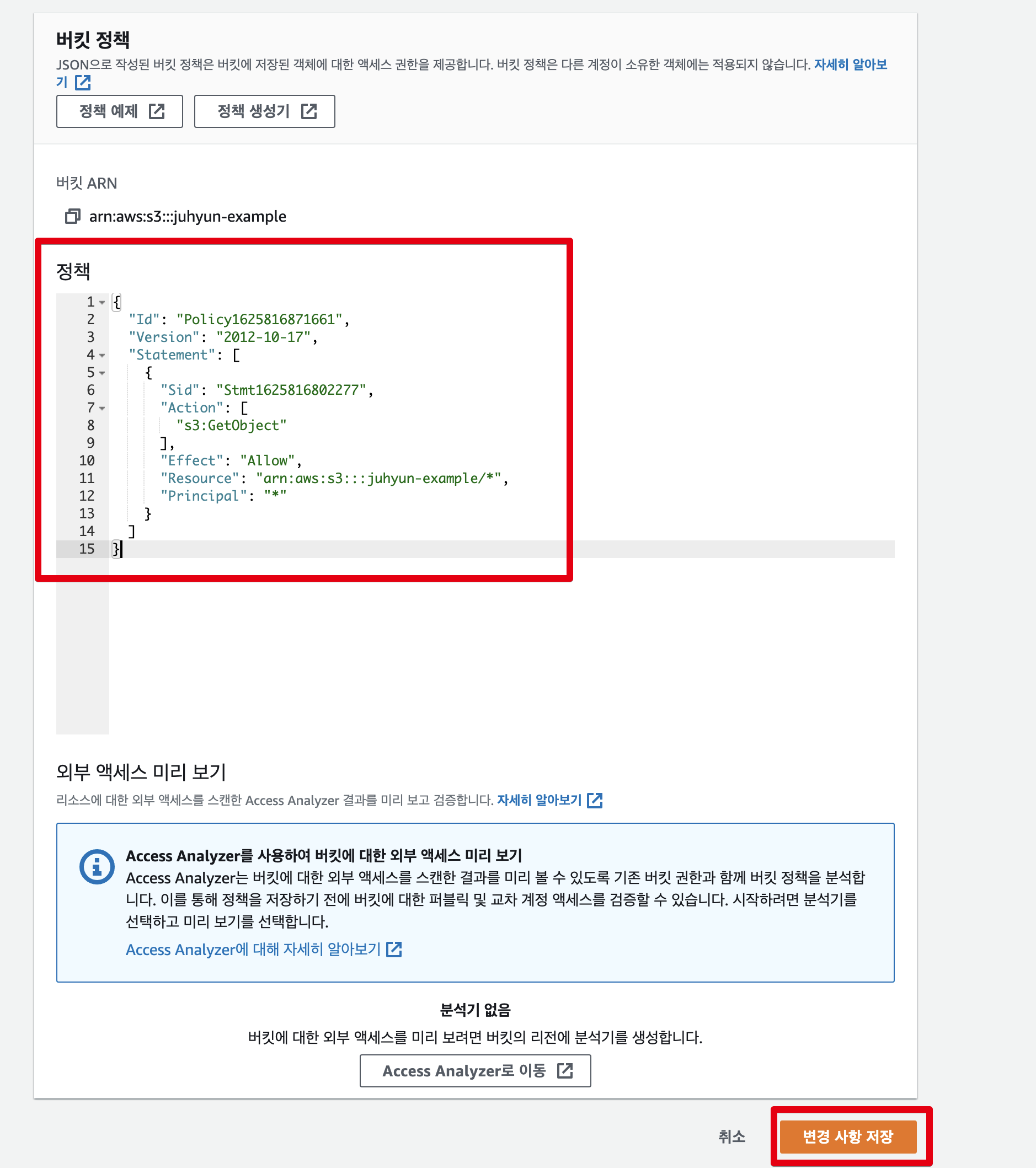 - Amazon Resource Name (ARN): arn:aws:s3:::{๋ฒํท์ด๋ฆ}/*