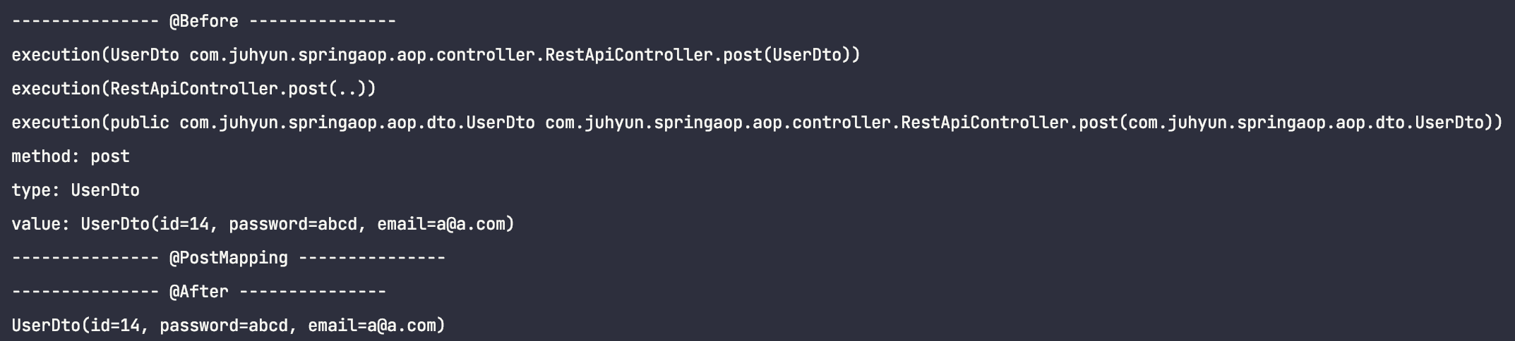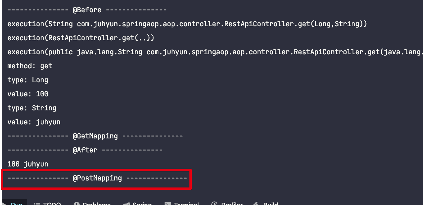 ν μ€νΈλ₯Ό ν΄λ³΄λ©΄ get λ©μλμλ λ¬λ¦¬ post λ©μλμλ AOP μ μ©μ΄ λμ§μμ κ±Έ νμΈν μ μμ΅λλ€.