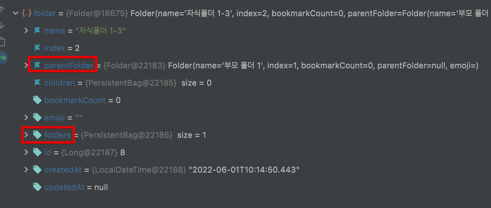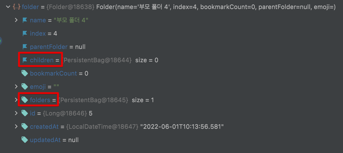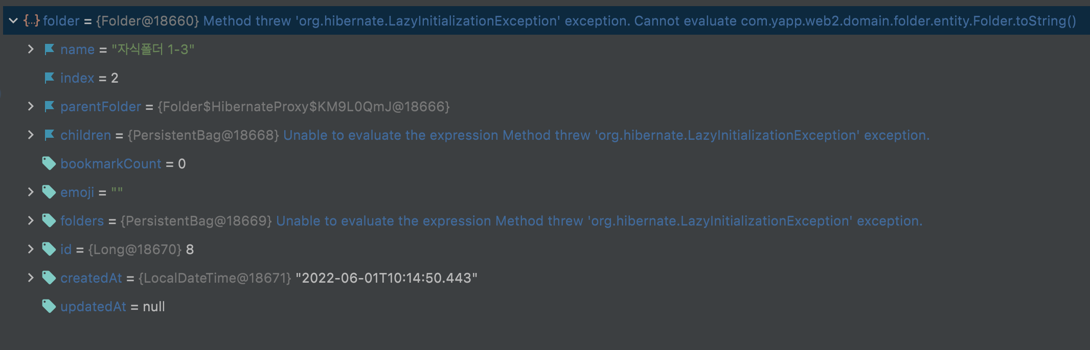 ๊ทธ ํ ๋๋ฒ๊น ์ ํตํด ๊ฐ์ ํ์ธํด๋ณด๋ฉด ์์์ ๋ฐ์ํ๋ LazyInitializationException ์์ธ๊ฐ ๋ฐ์ํ์ง ์๋ ๊ฒ์ ํ์ธํ ์ ์์ต๋๋ค.