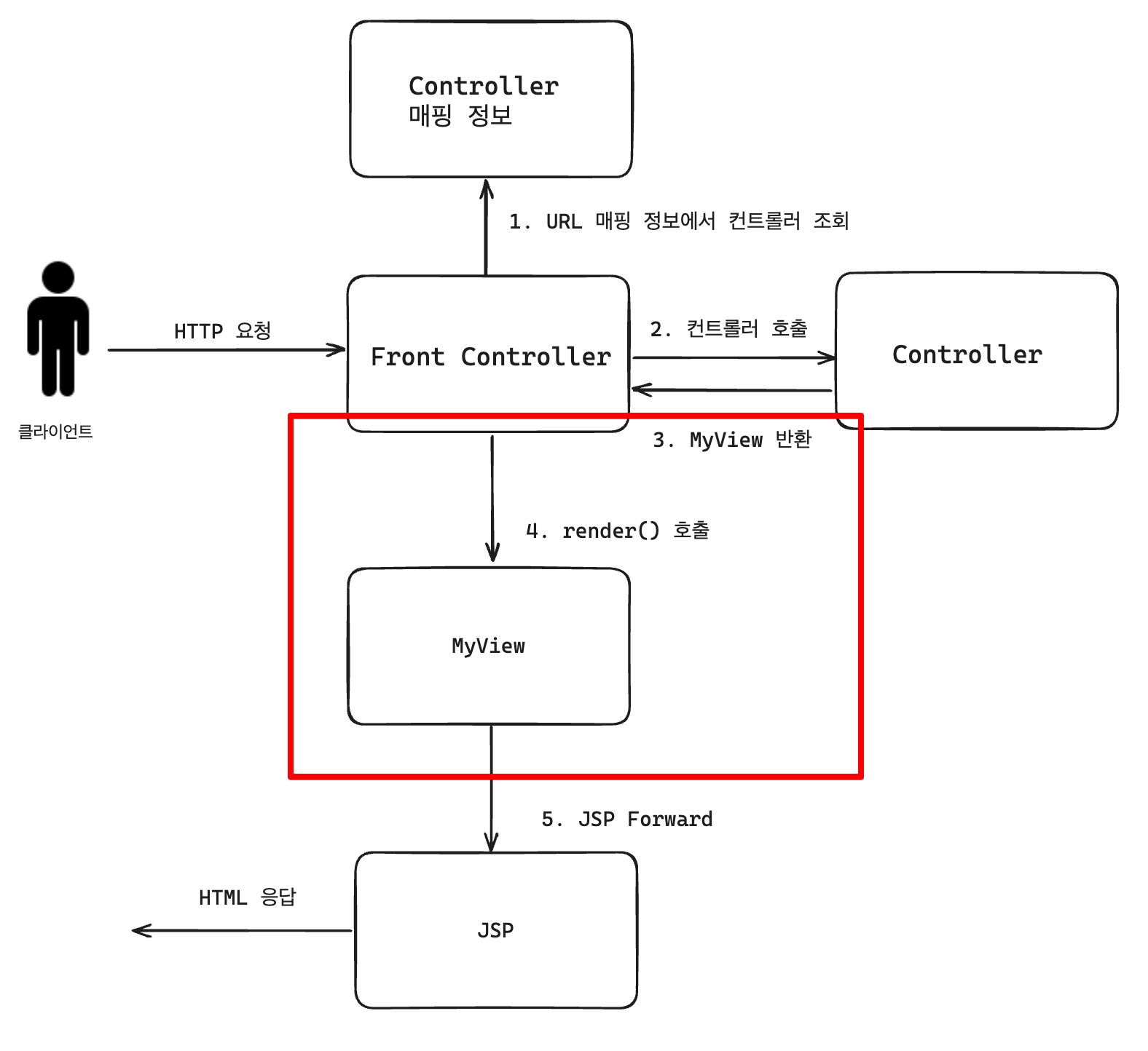 V2 Controller๋ ๋ก์ง์ ์ฒ๋ฆฌํ ํ MyView ๊ฐ์ฒด๋ฅผ ๋ฐํํ๊ณ , Servlet์์ ์ด๋ฅผ ๋ฐ์ render() ๋ฉ์๋๋ฅผ ์คํํ๋ฉด MyView ๊ฐ์ฒด๊ฐ JSP๋ฅผ forwardํ์ฌ ์ฒ๋ฆฌํ๊ฒ ๋ฉ๋๋ค.