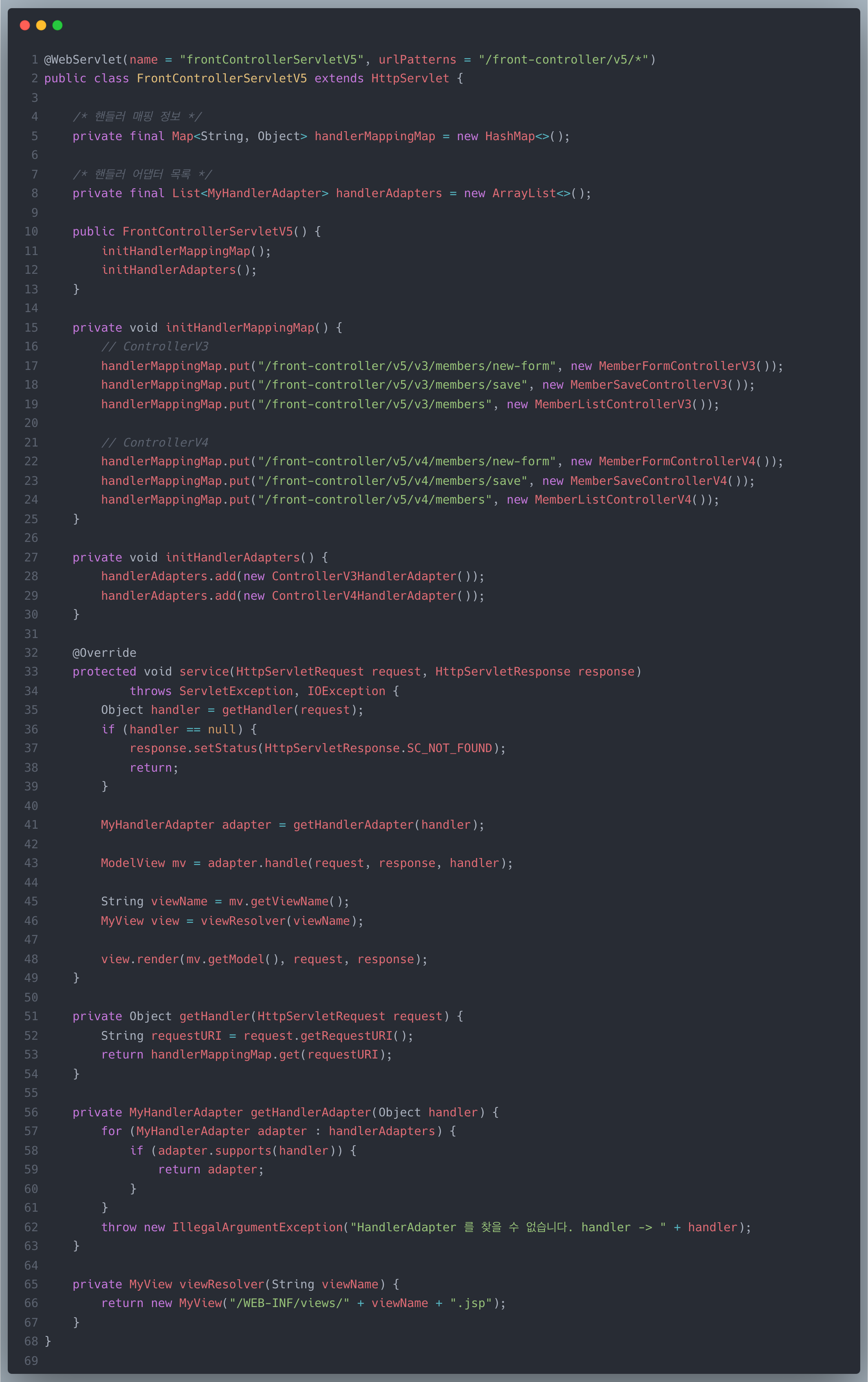 ์ด๋ฒ ํฌ์คํ ์์ ์ง์ ๋ง๋ค์ด๋ณธ ํ๋ก ํธ ์ปจํธ๋กค๋ฌ ํจํด์ ์คํ๋ง ํ๋ ์์ํฌ์๋ ๋ด๋ถ์ ์ผ๋ก ๋์ผํ๊ฒ ๊ตฌํ์ด ๋์ด ์๋๋ฐ์, ์ฌ์ฉํ ๊ฐ์ฒด๋ค (HandlerAdapter, ModelView ๋ฑ) ๋ํ ์คํ๋ง์ ๋น์ทํ ๋ค์ด๋ฐ์ ๊ฐ์ฒด๊ฐ ์กด์ฌ ํฉ๋๋ค.